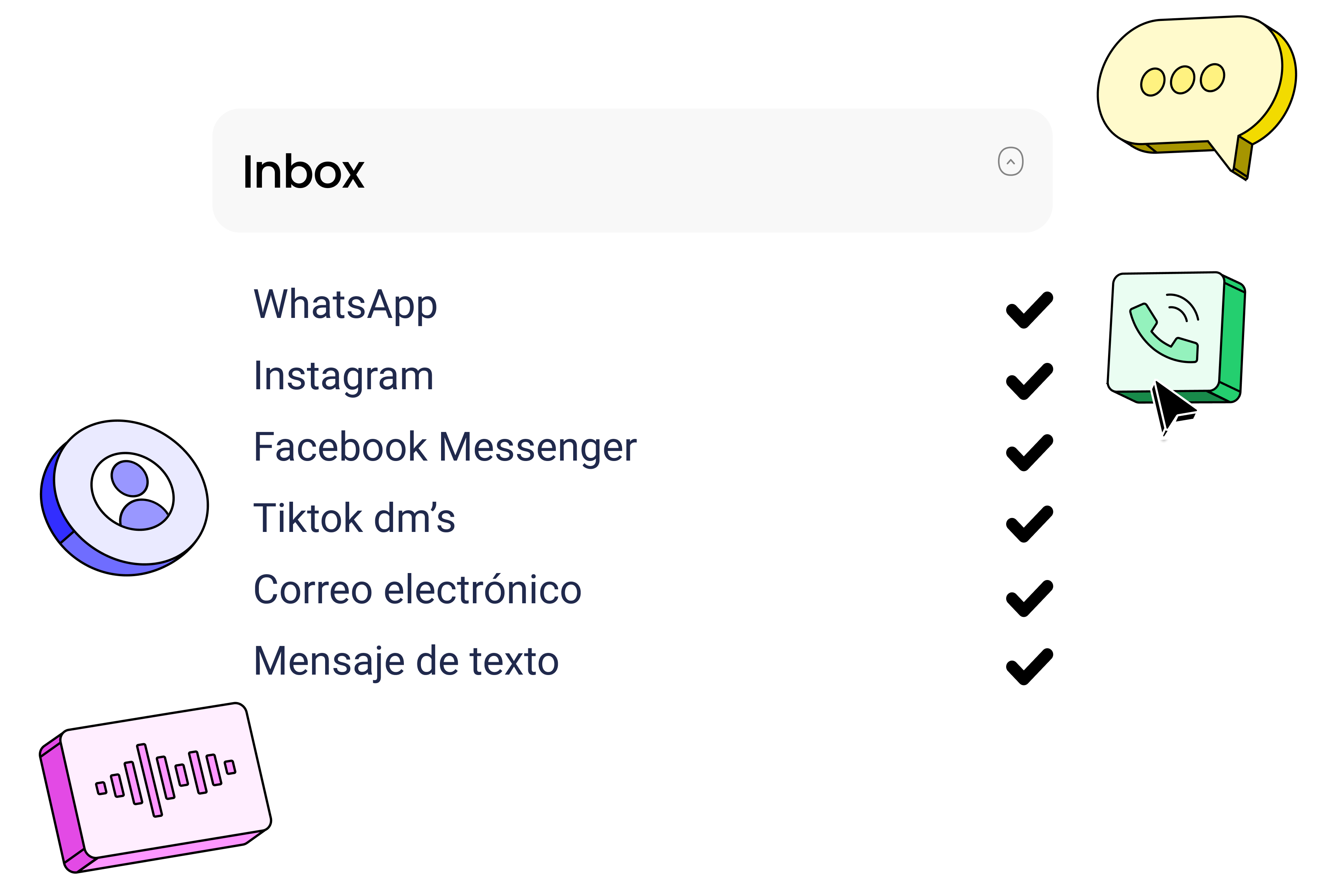 - Bandeja unificada multicanal (WhatsApp, Correo electrónico, Instagram DM, Messenger, Tiktok DM, llamadas, SMS, Tiktok DM entre otros)